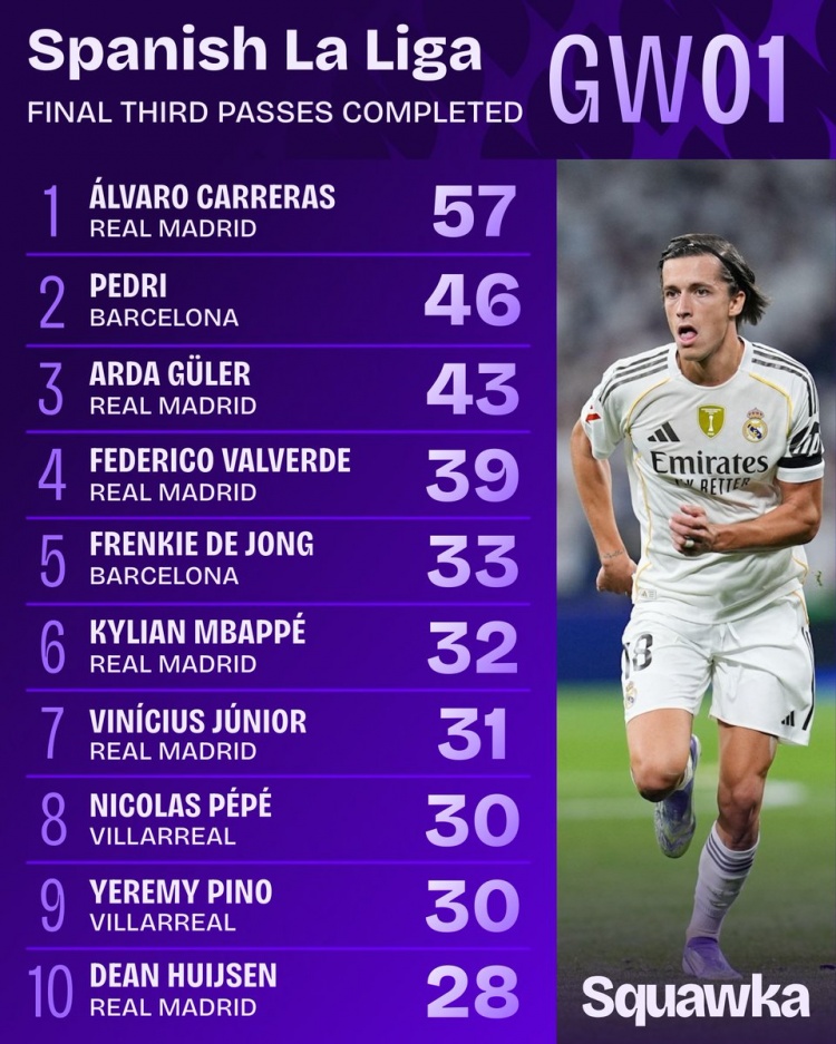 西甲首轮赛事结束后,Squawka公布进攻三区传球数据,皇马球员A费以57次传球位列榜首,巴萨的佩德里与皇马的居勒尔分列二、三位。